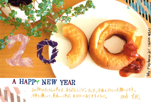 まったくオンの方の反応が鈍くて、申し訳なく。年賀状が一枚余ったので、ネット用にアップ。最近、手で物を作るという、基本的なことに、返ってみようかなーと、思って。自分で写真撮って、自分で印刷して、手書きで書いたり、テープやらスタンプやらレースやらでデコったりと、オフ作業で地道にやってみました。まぁ、印刷はパソコンとプリンターが頑張ったわけですけど(笑)